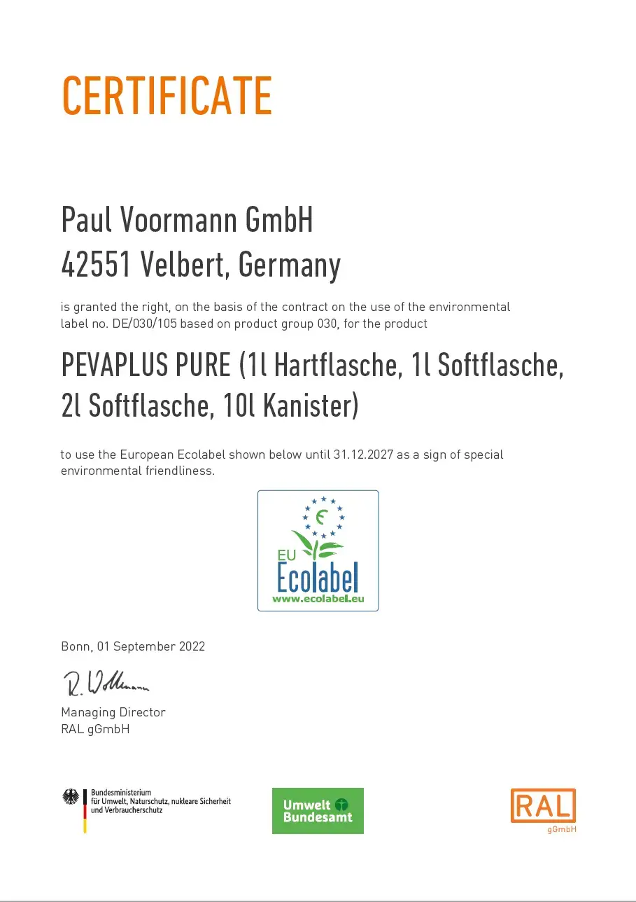 PEVAPLUS PURE – Ecolabel certifcate