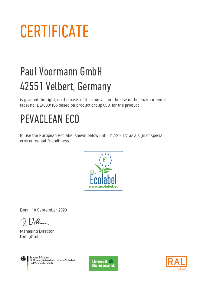 PEVACLEAN ECO – Ecolabel certficate