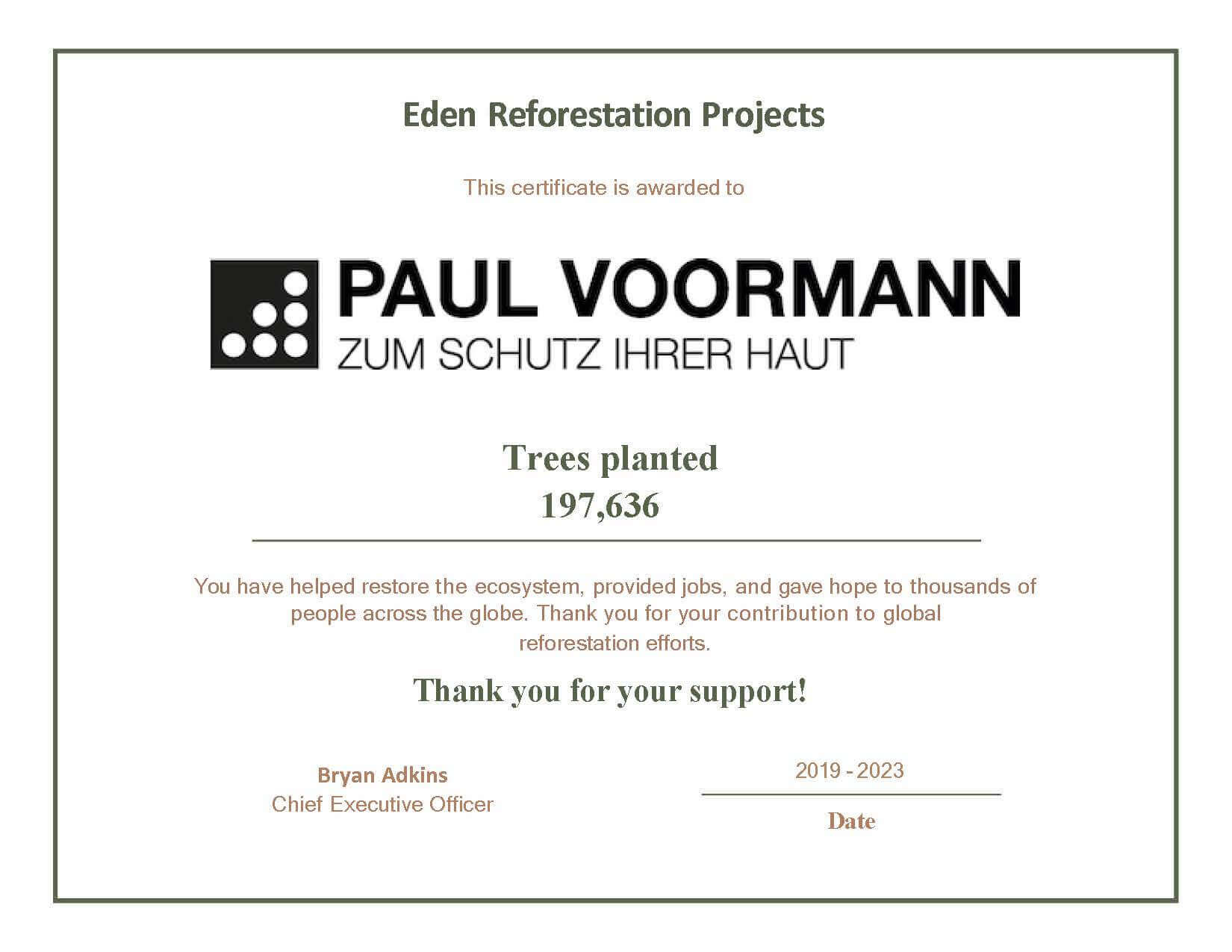 Since 2019, there has been a partnership with one of the world’s largest tree planting organizations Eden: People+Planet. Since this time, more than 197,636 trees have already been planted as part of a sales campaign, but also through the company’s own donations! A certificate from EDEN certifies this.